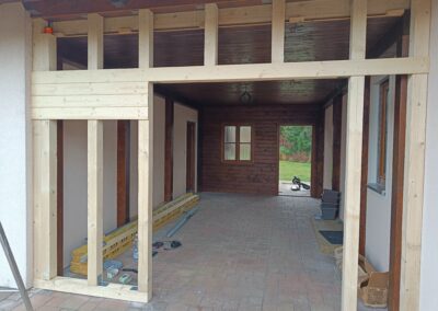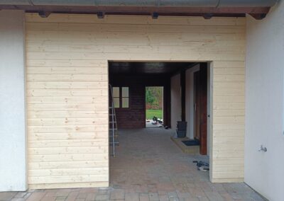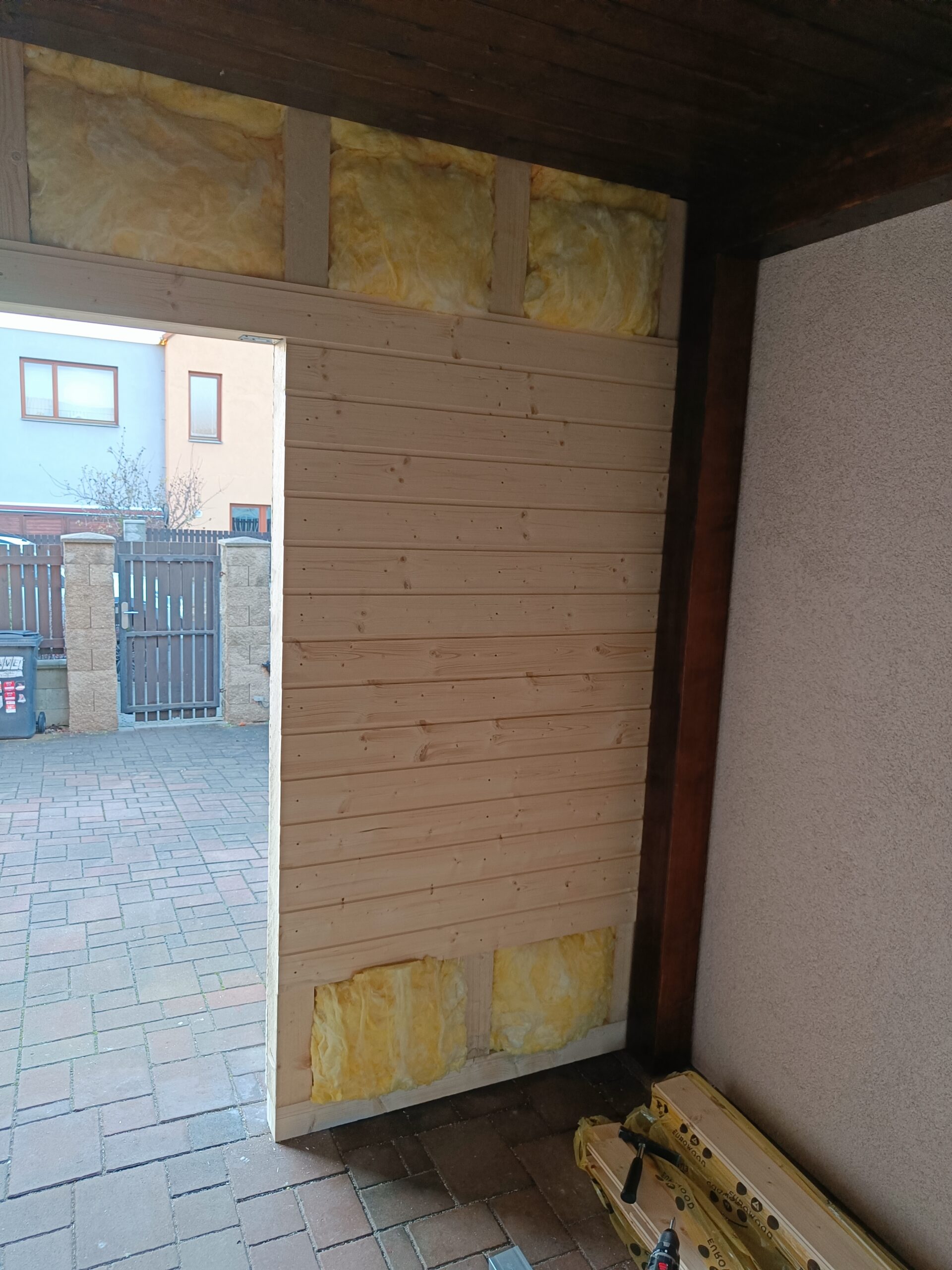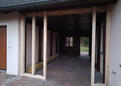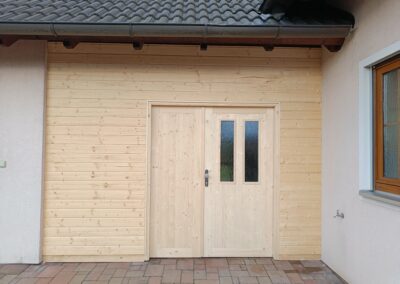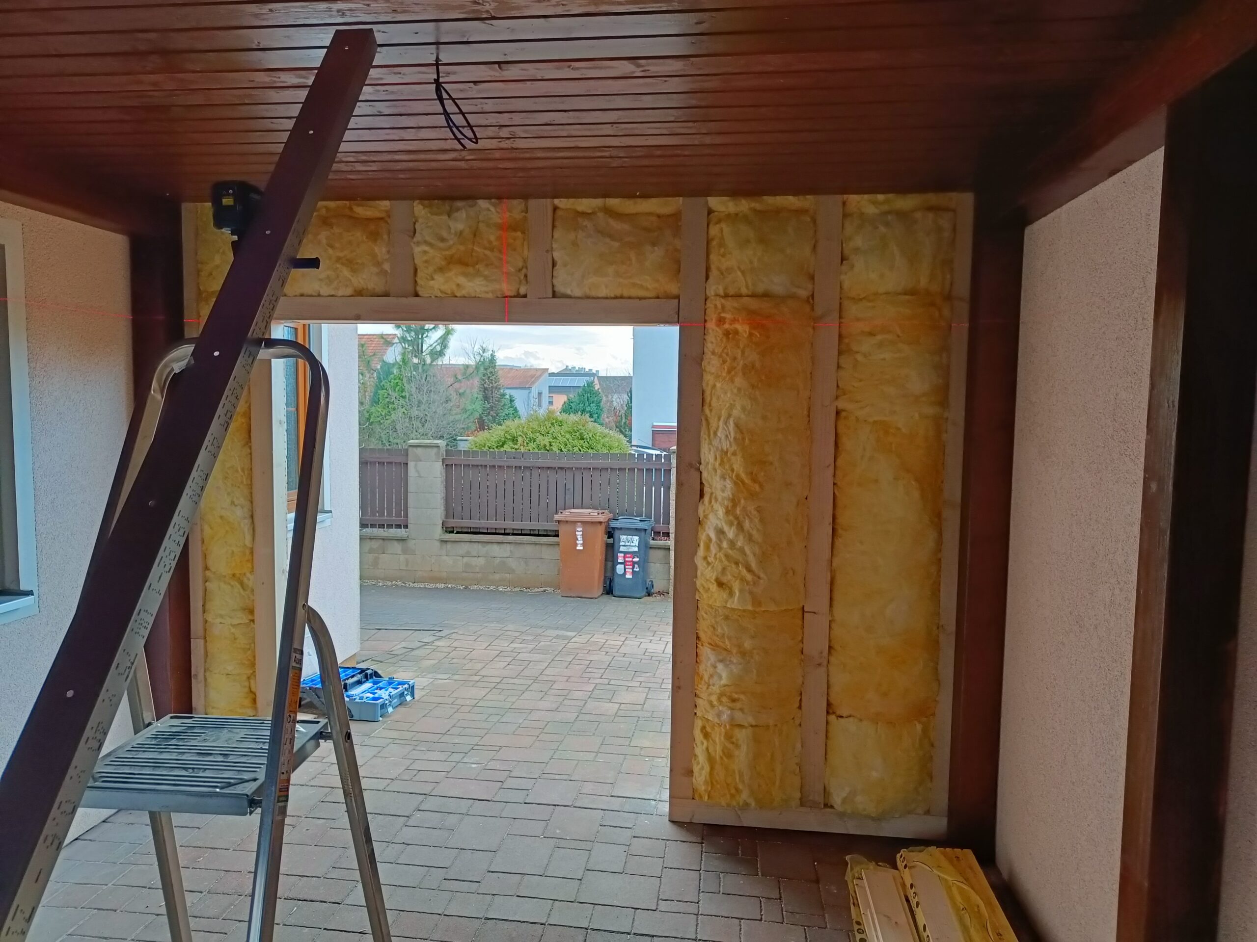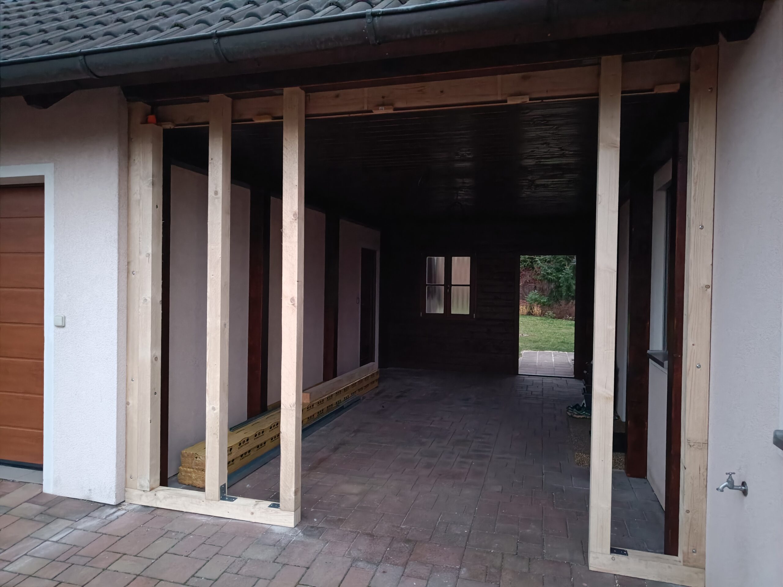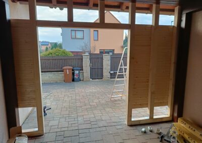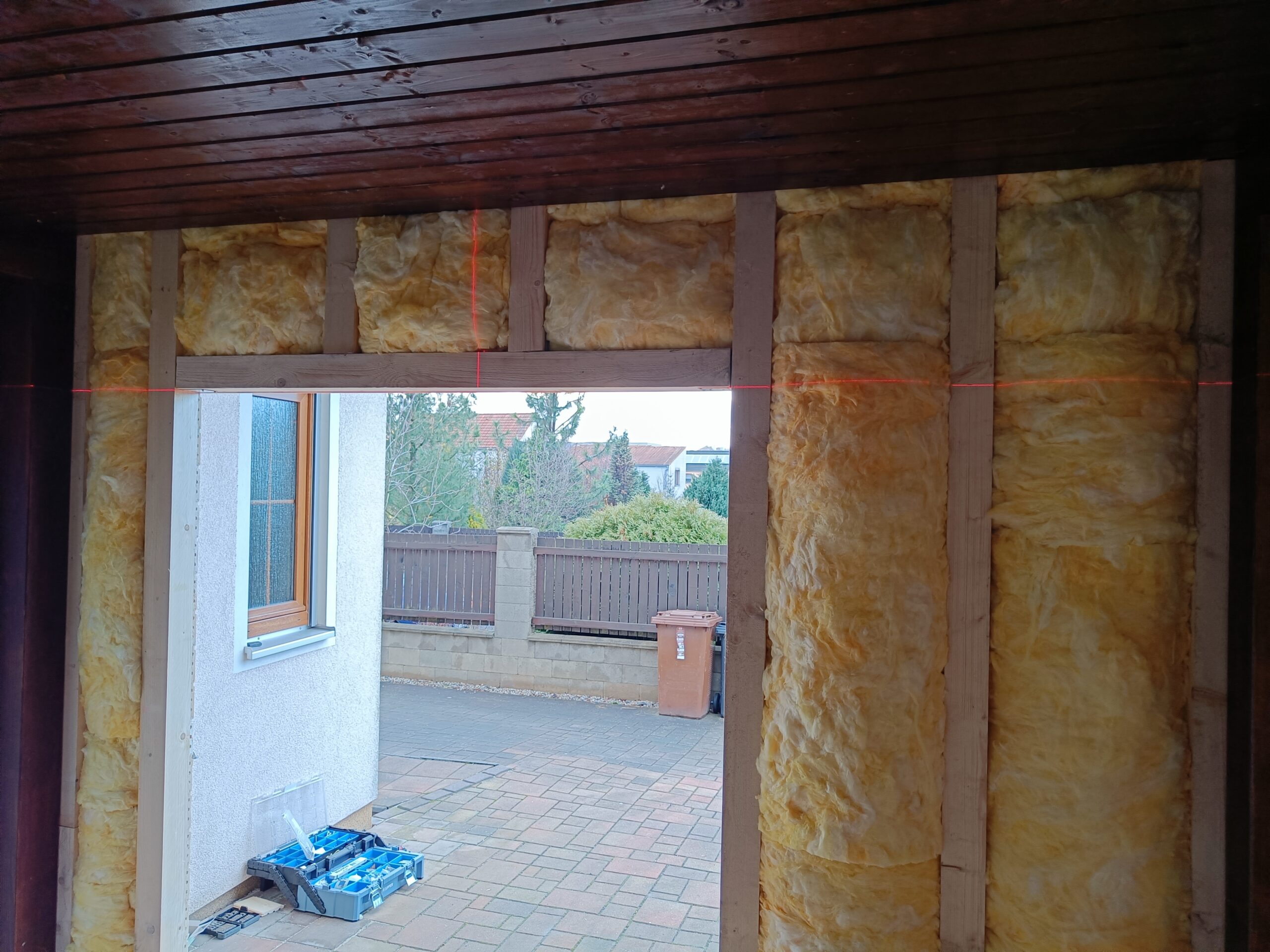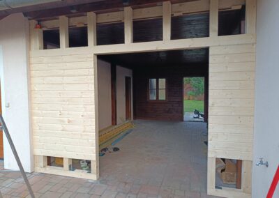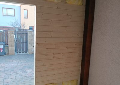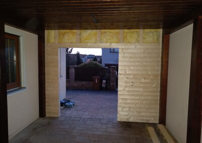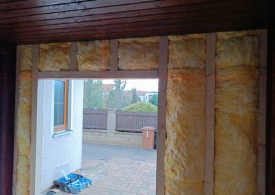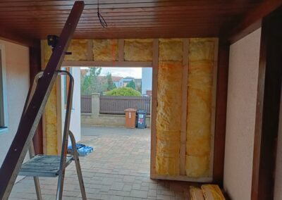 Přístavba stěny s dvoukřídlými dveřmi a izolací.