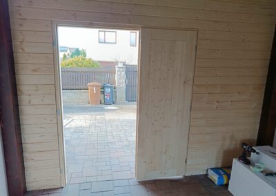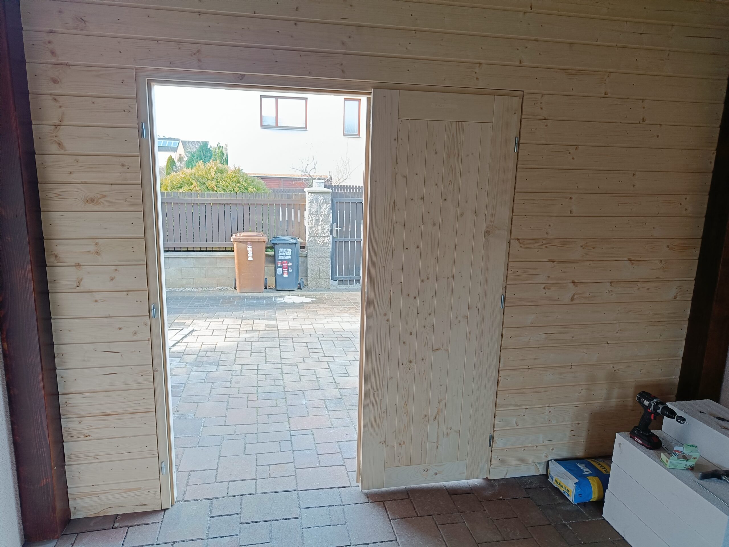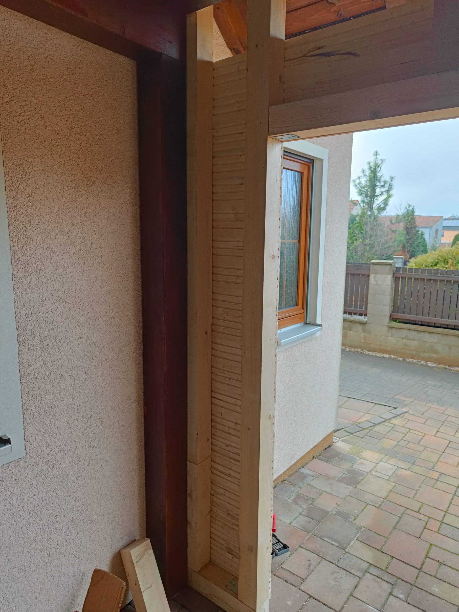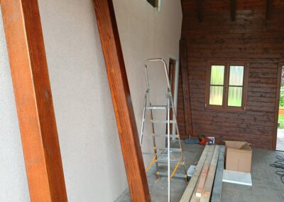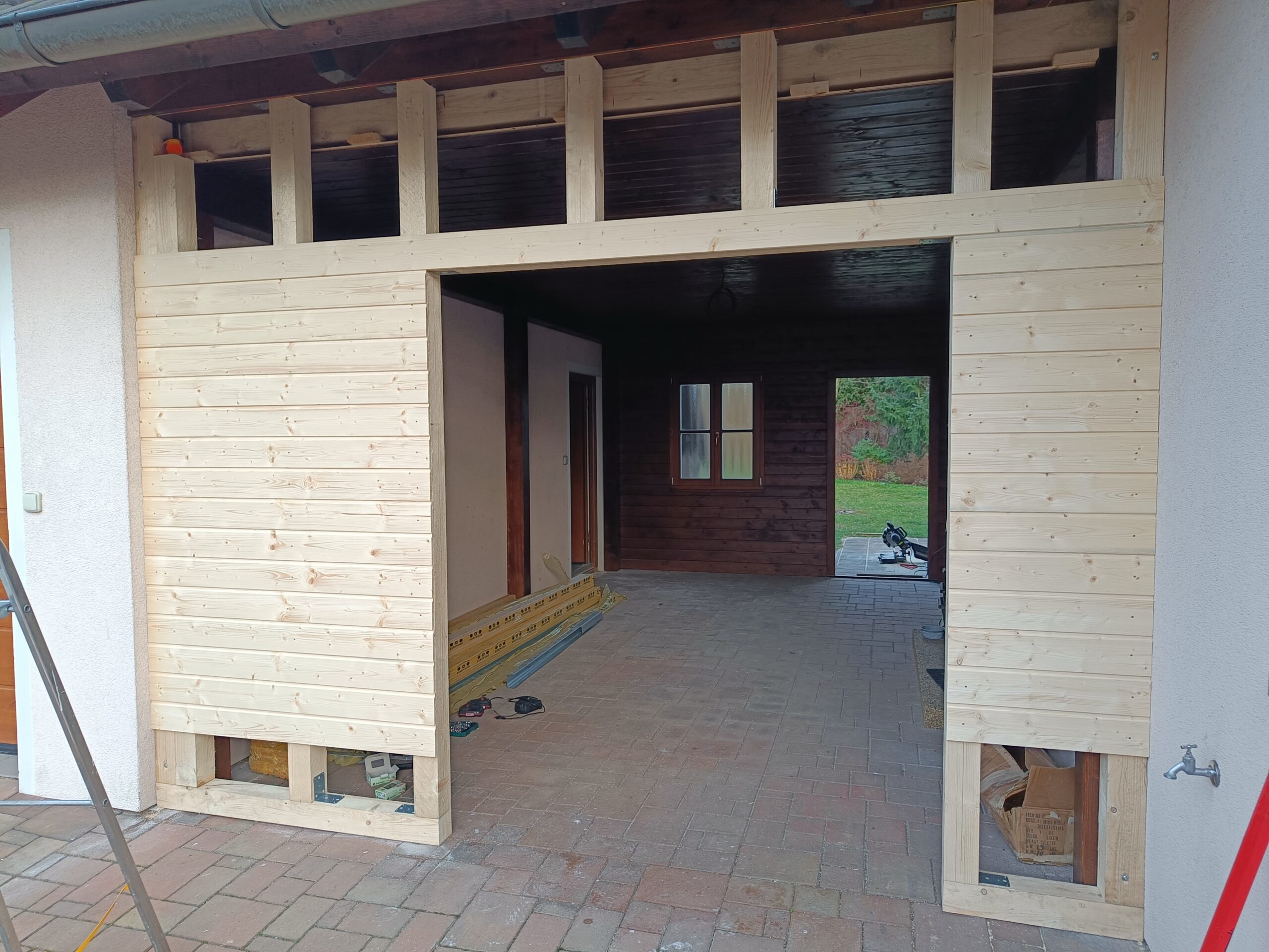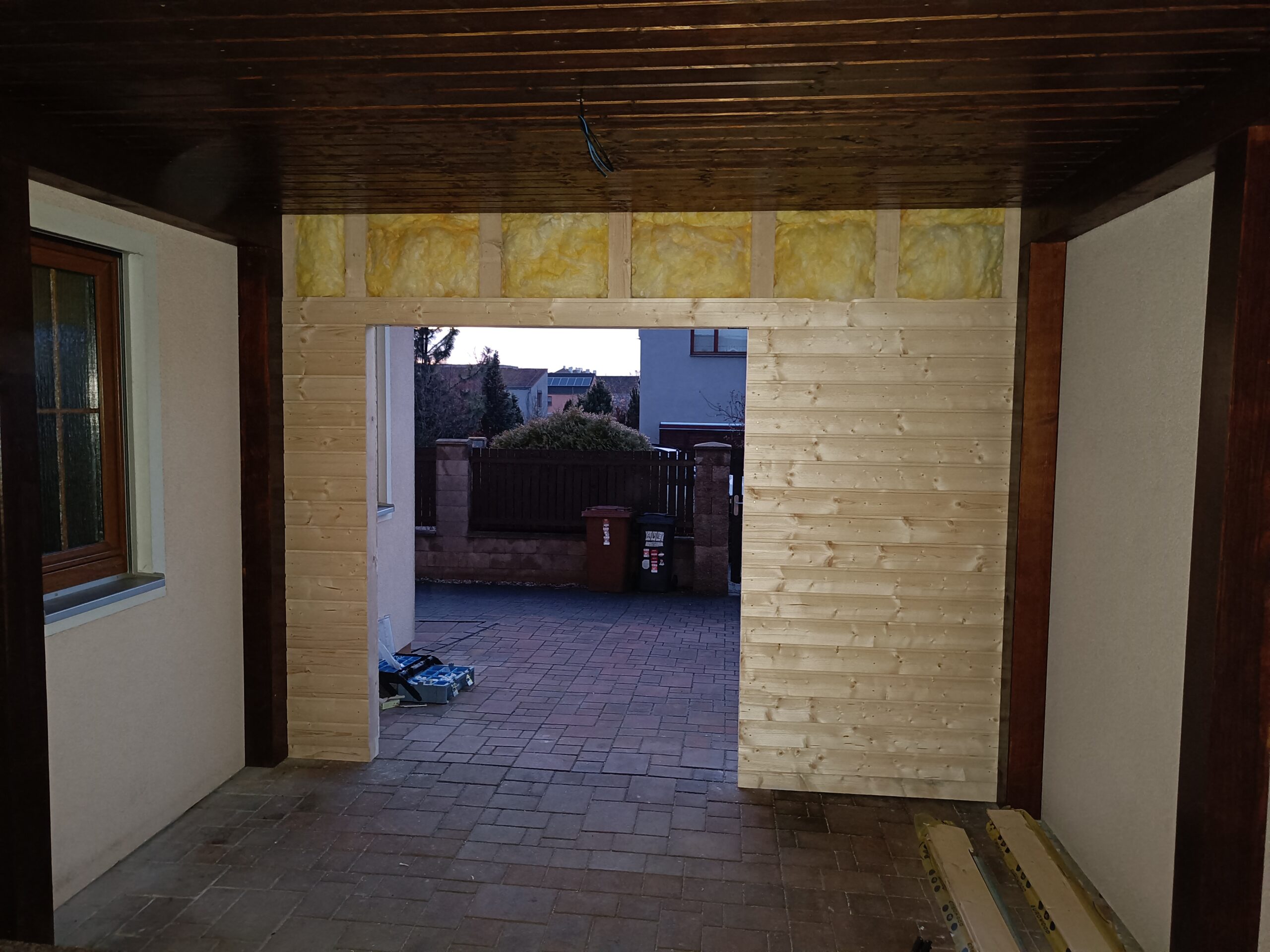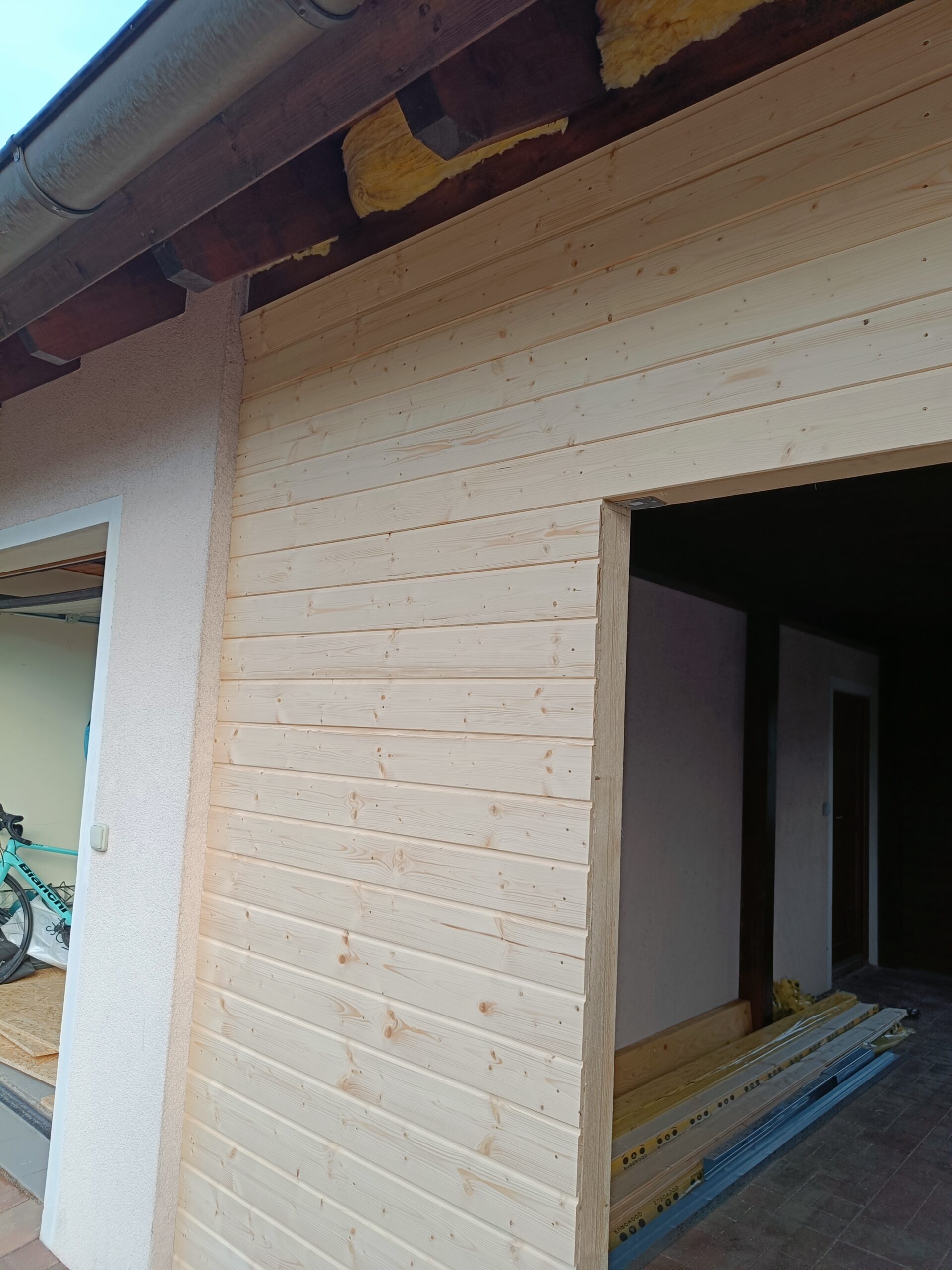 Přístavba stěny s dvoukřídlými dveřmi a izolací.