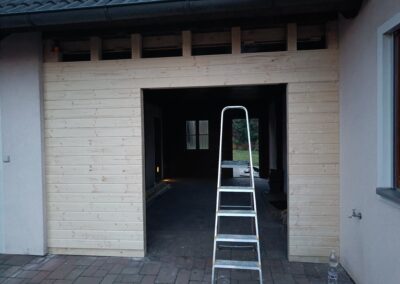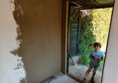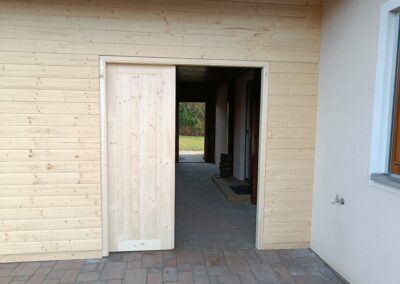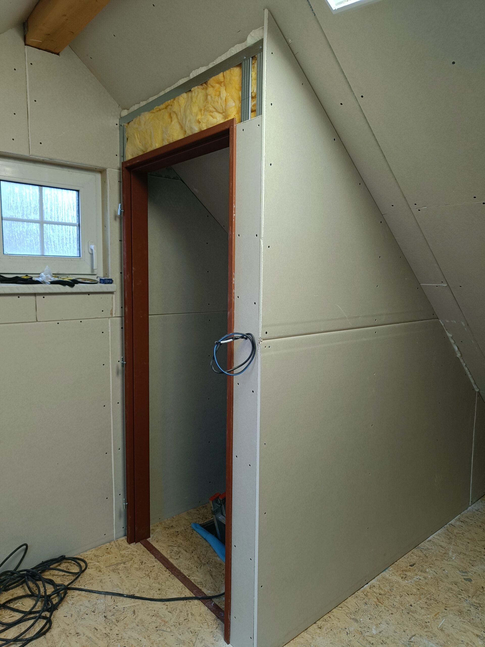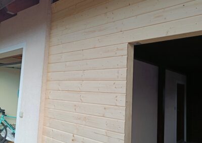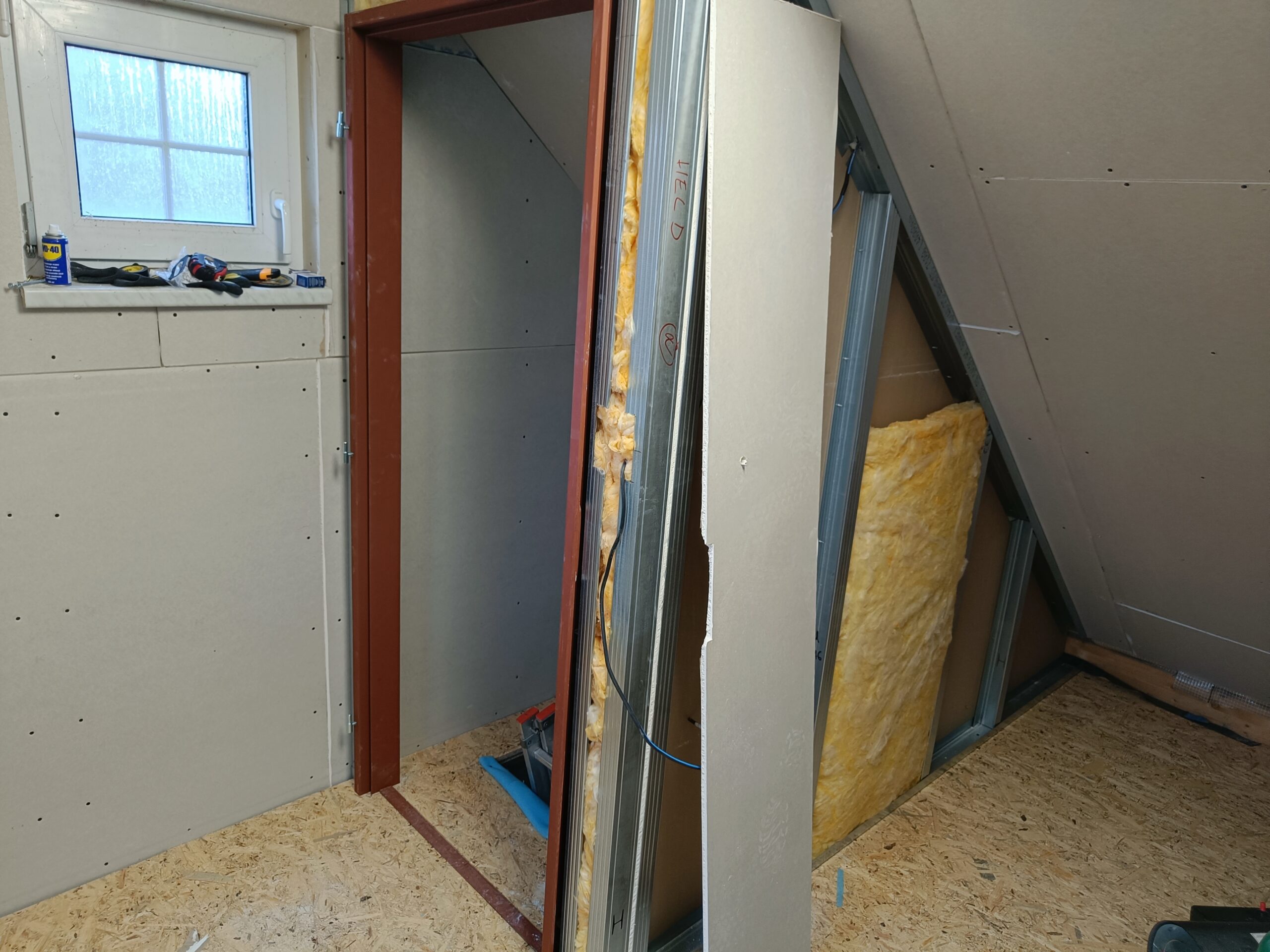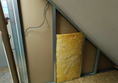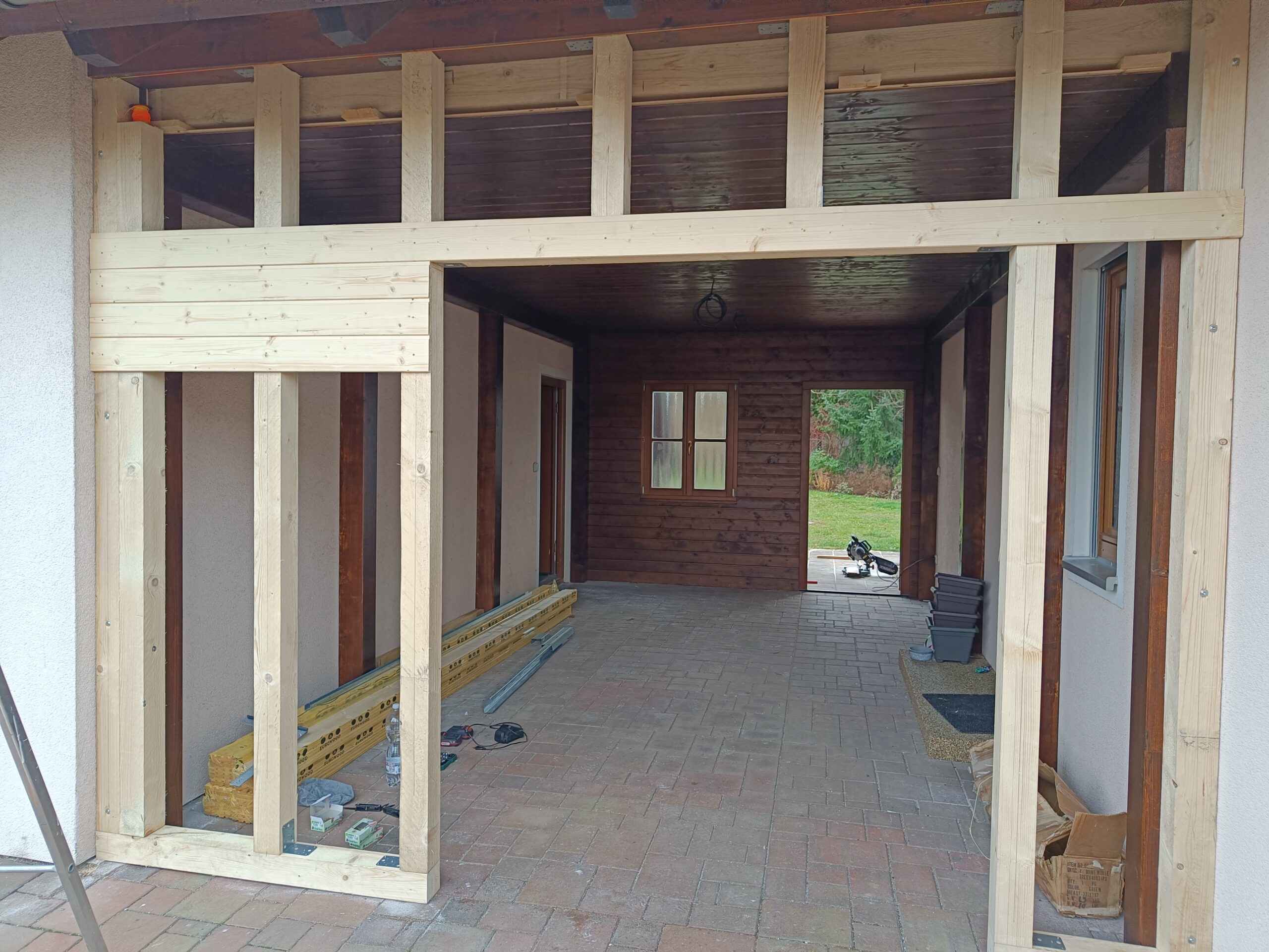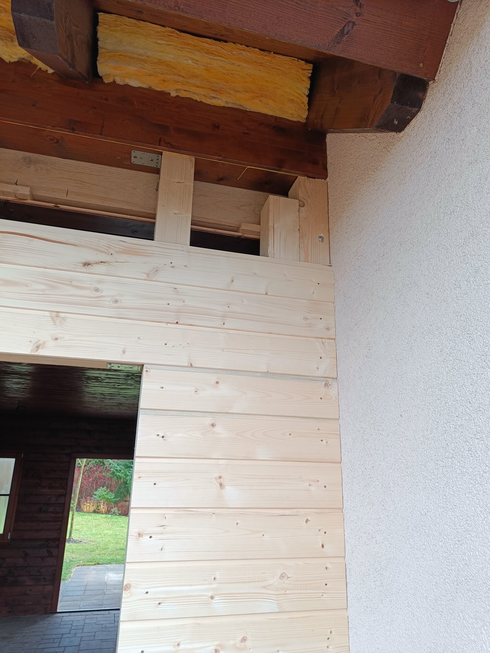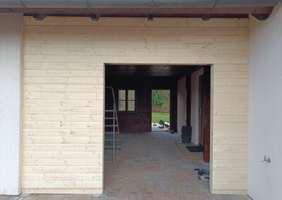 Přístavba stěny s dvoukřídlými dveřmi a izolací.