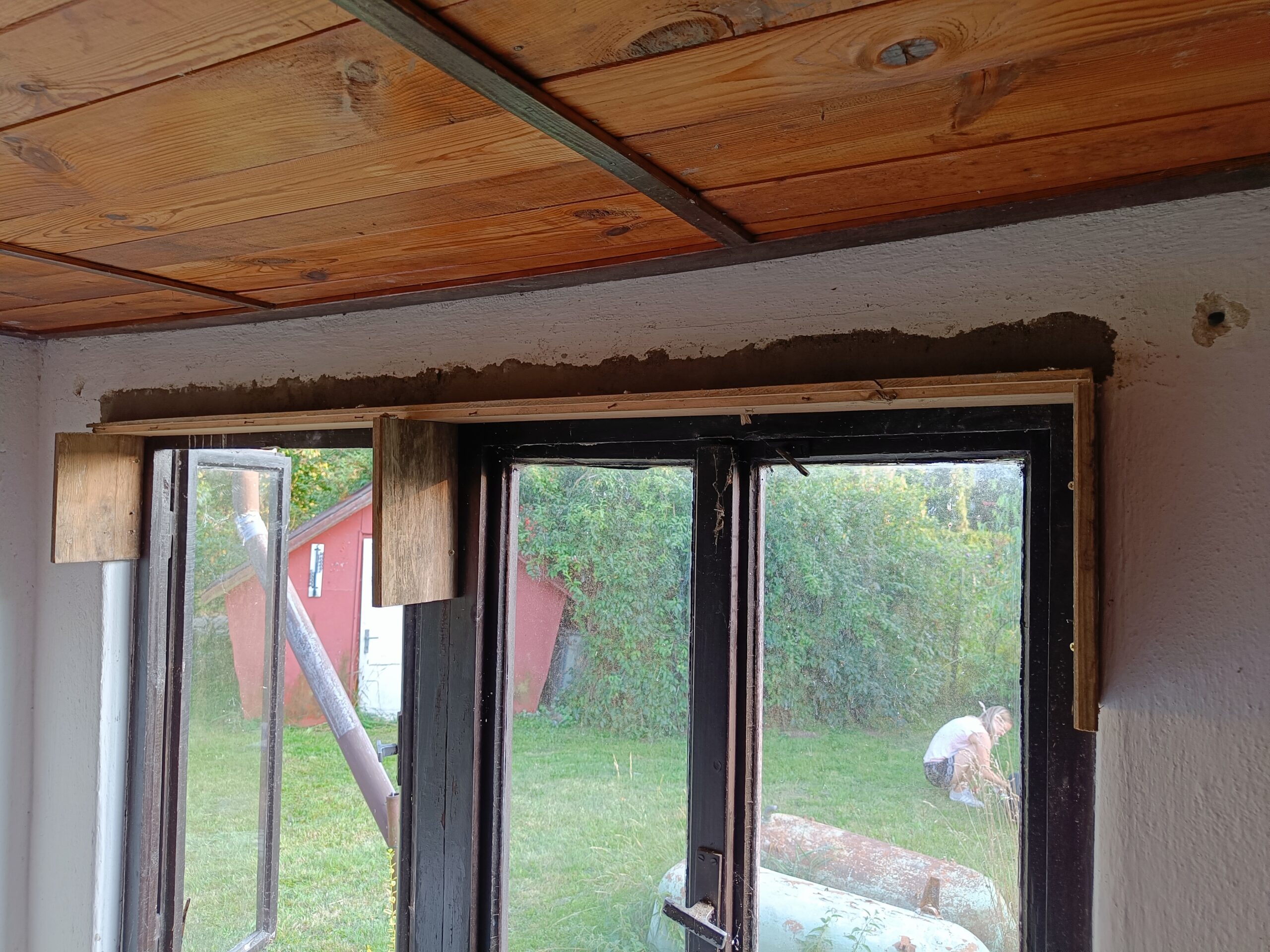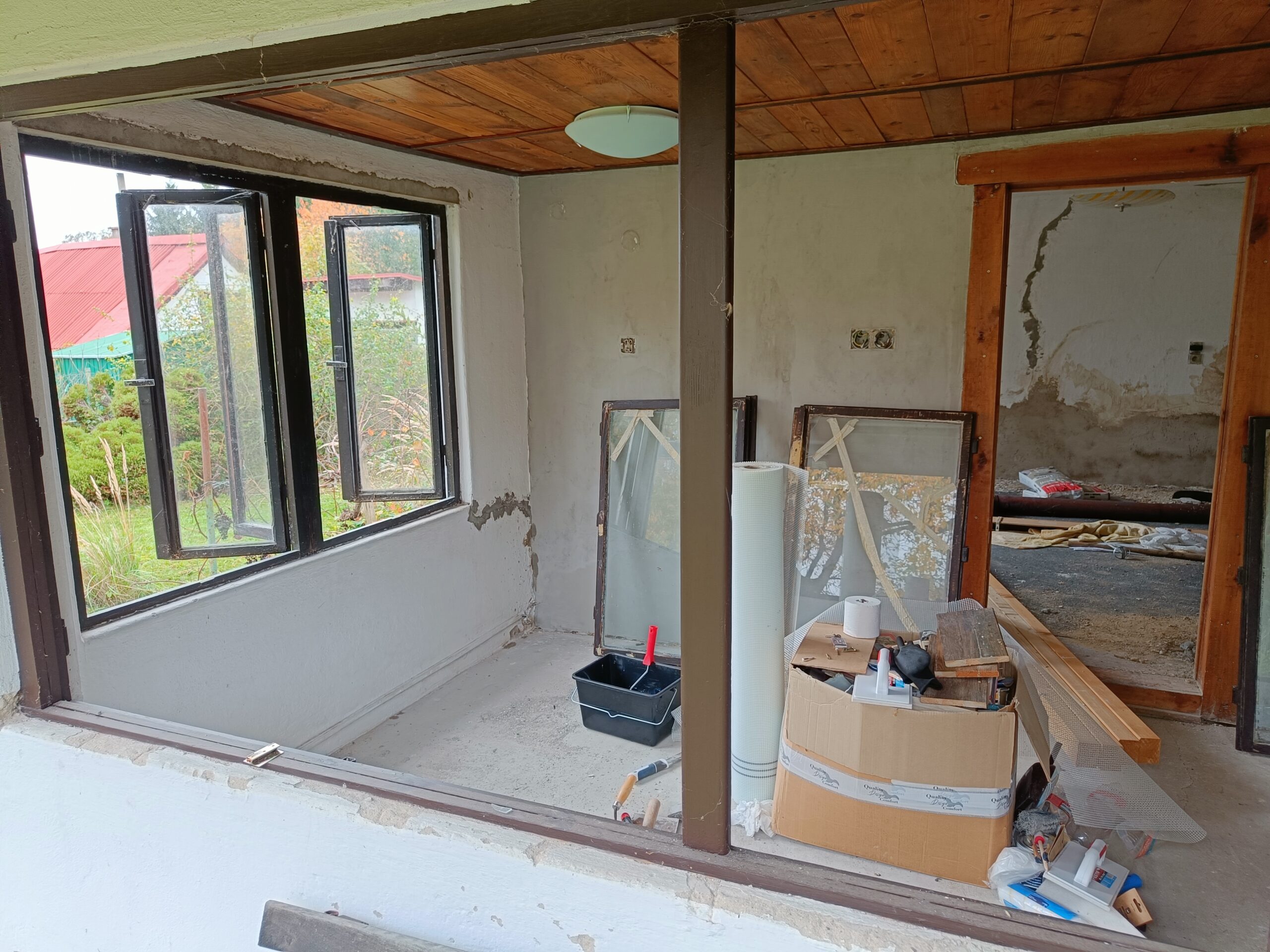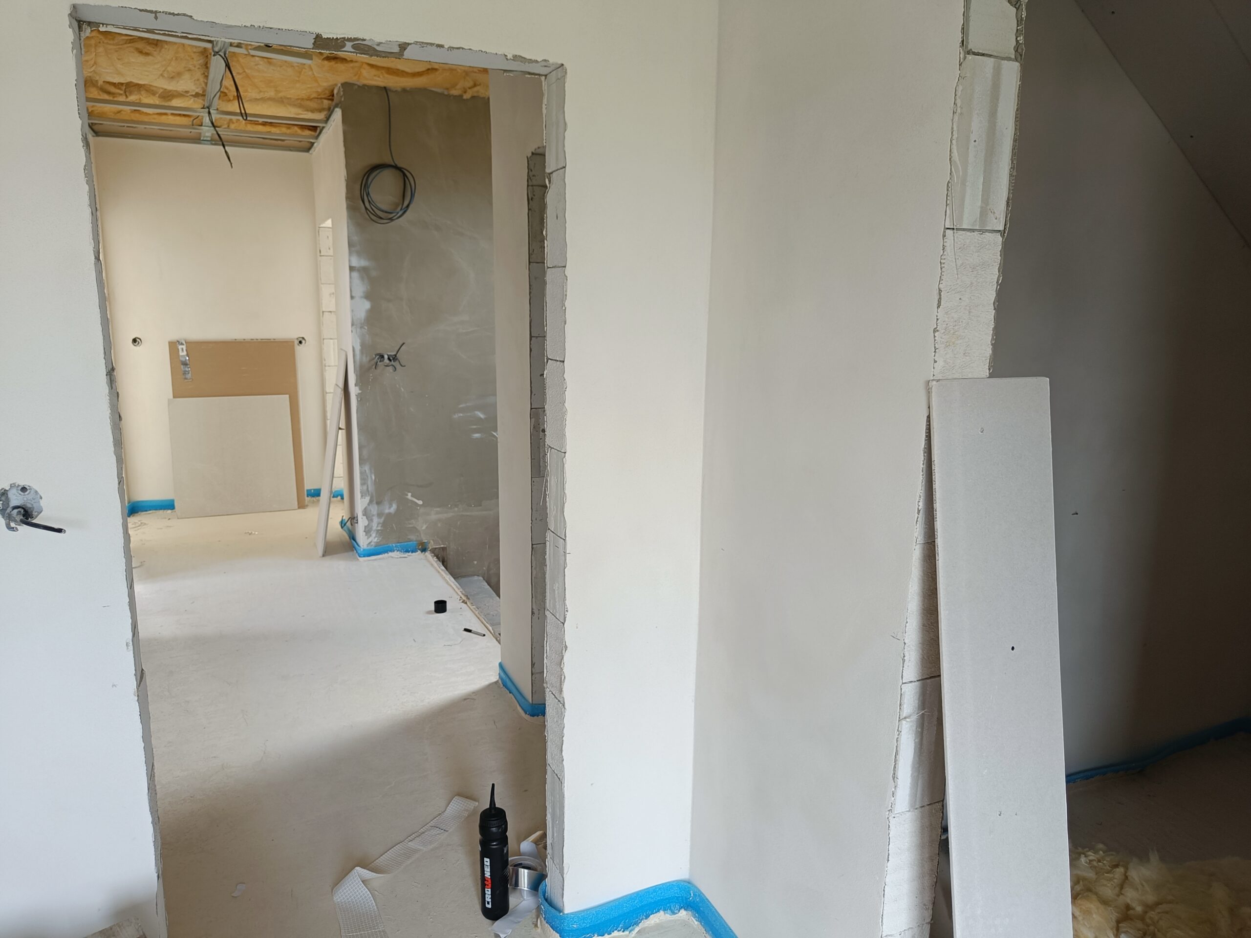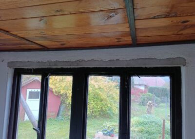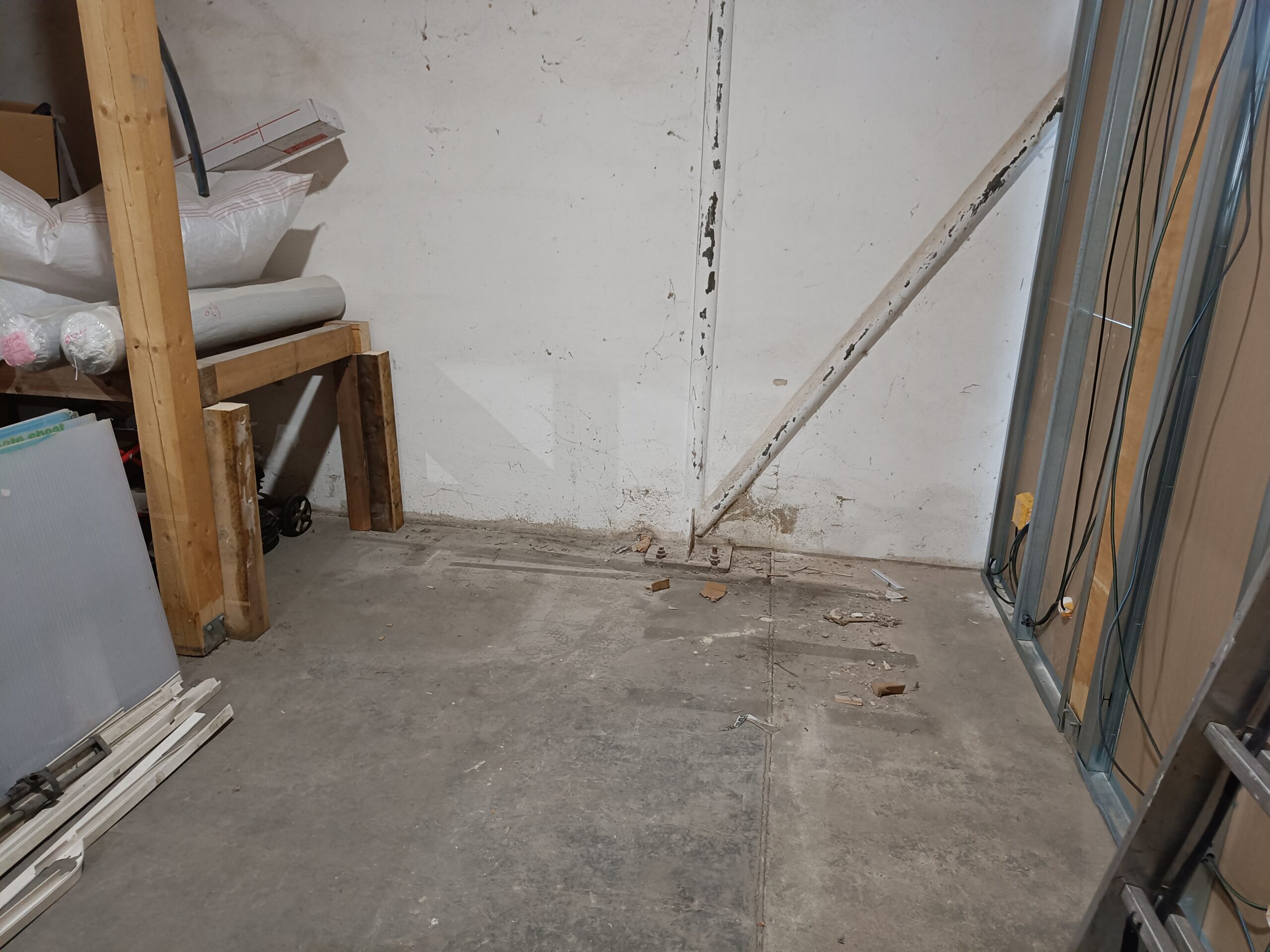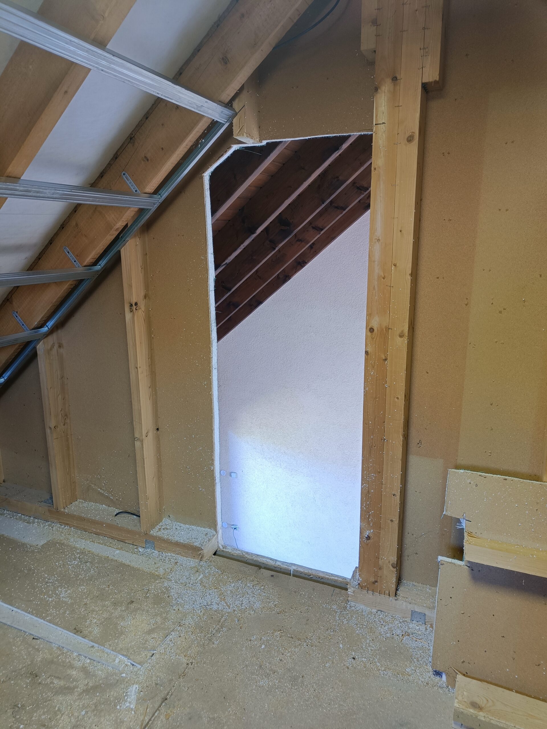 Přístavba stěny s dvoukřídlými dveřmi a izolací.