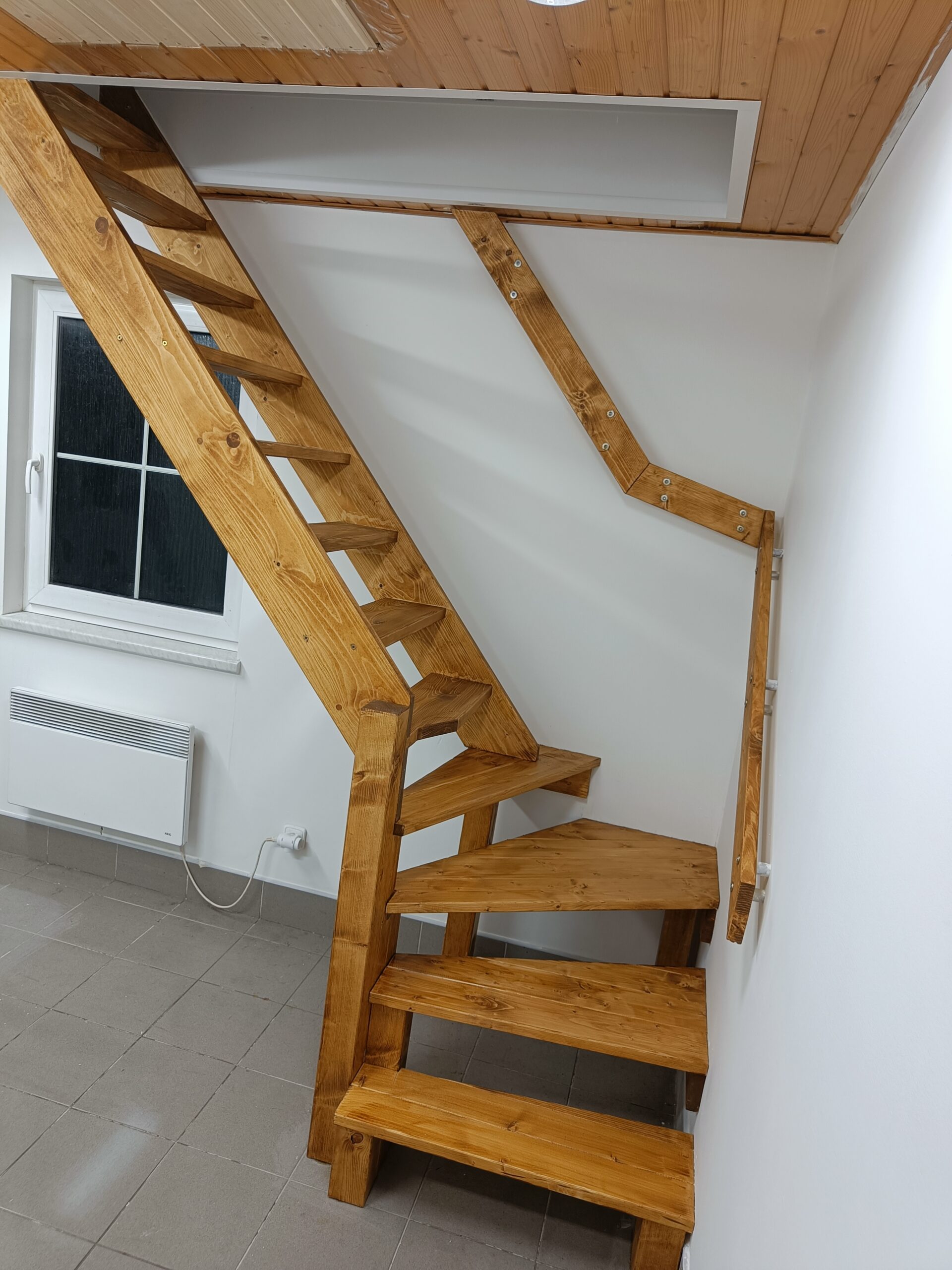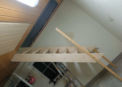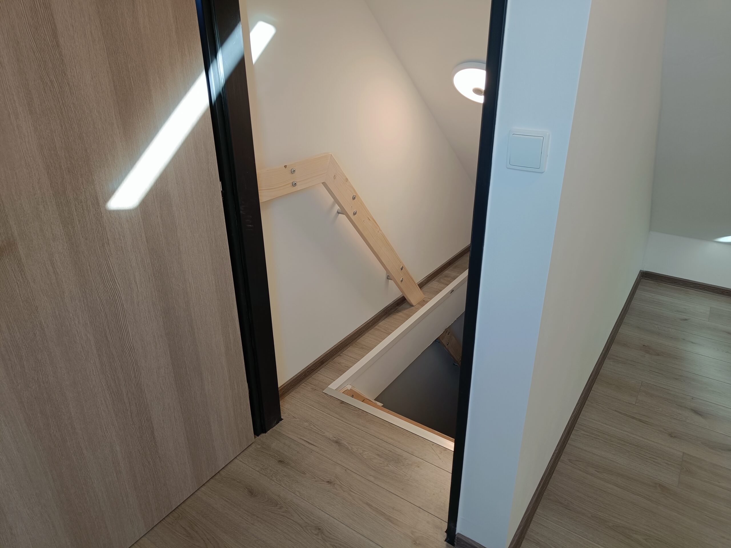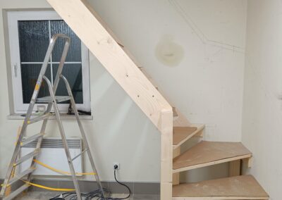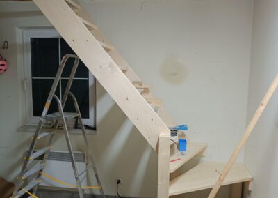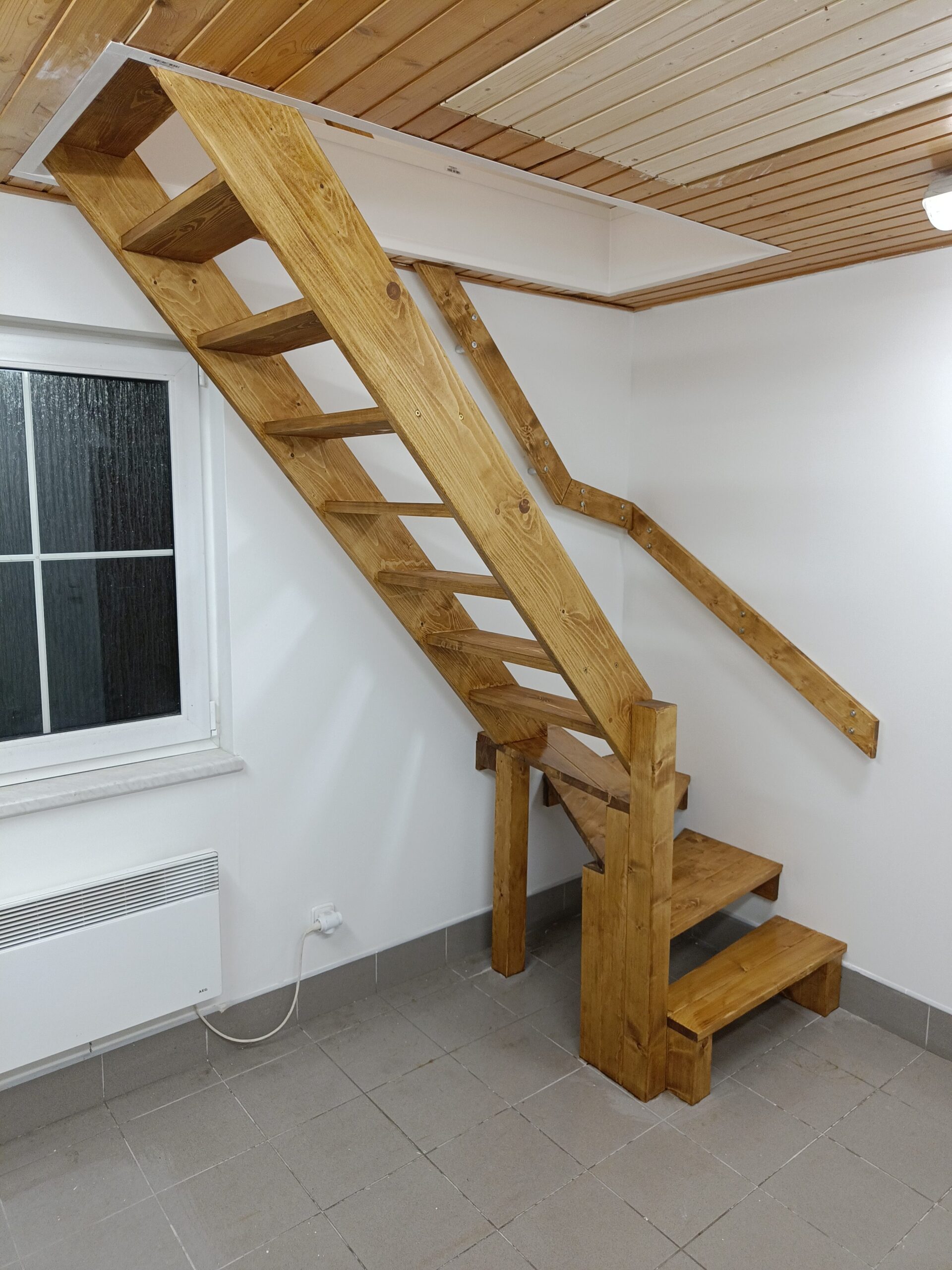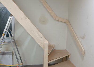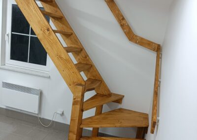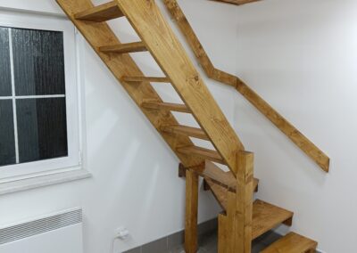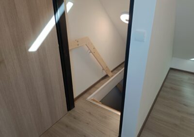 Dřevěné schody do patra z garáže.
