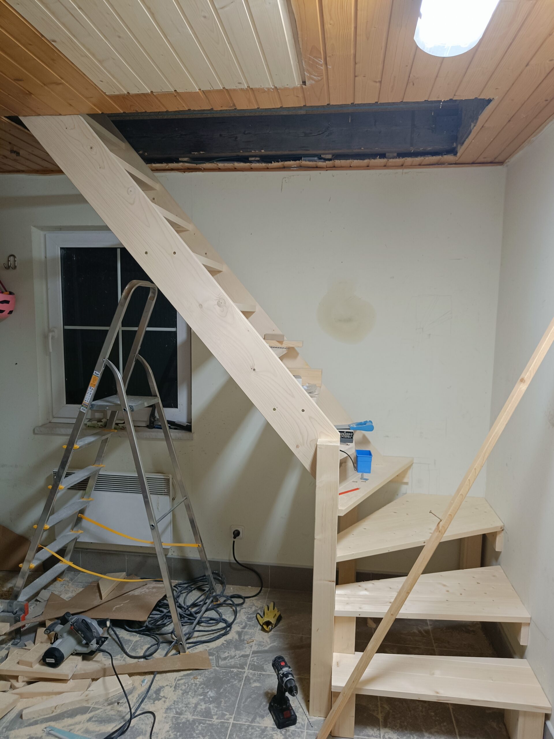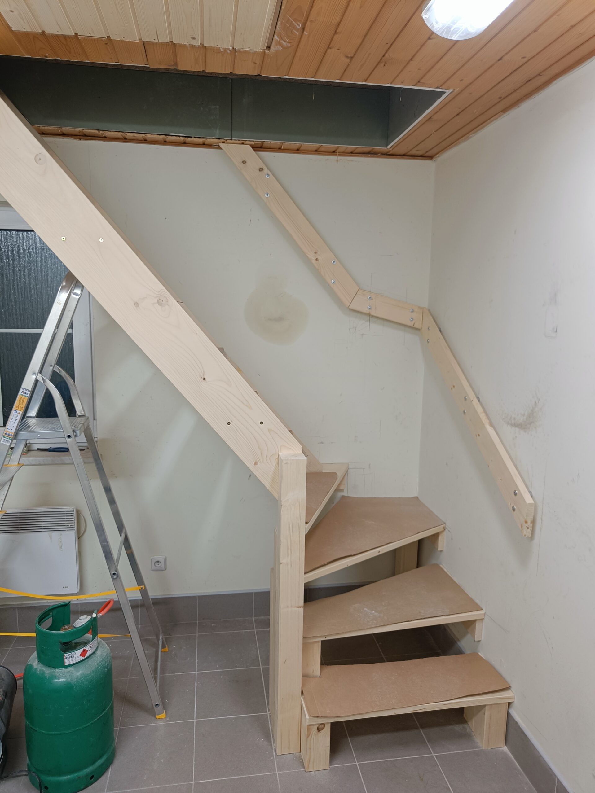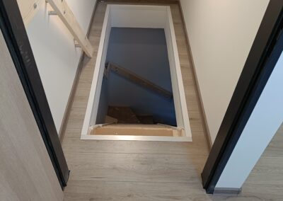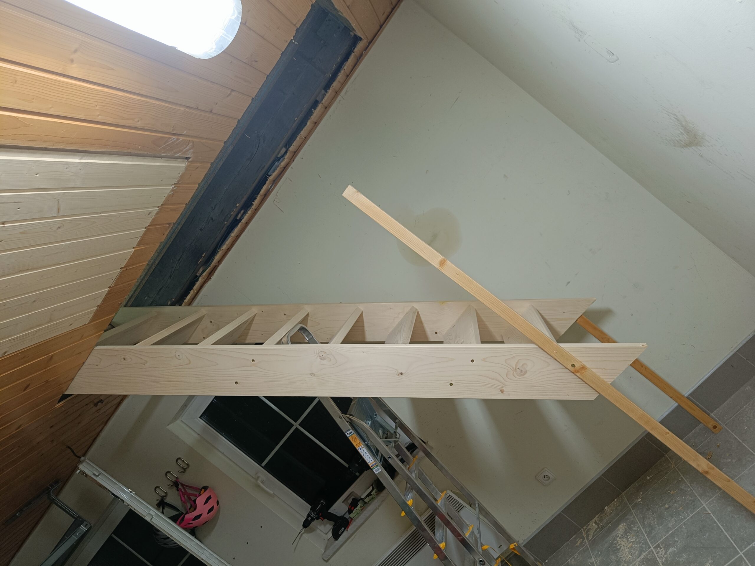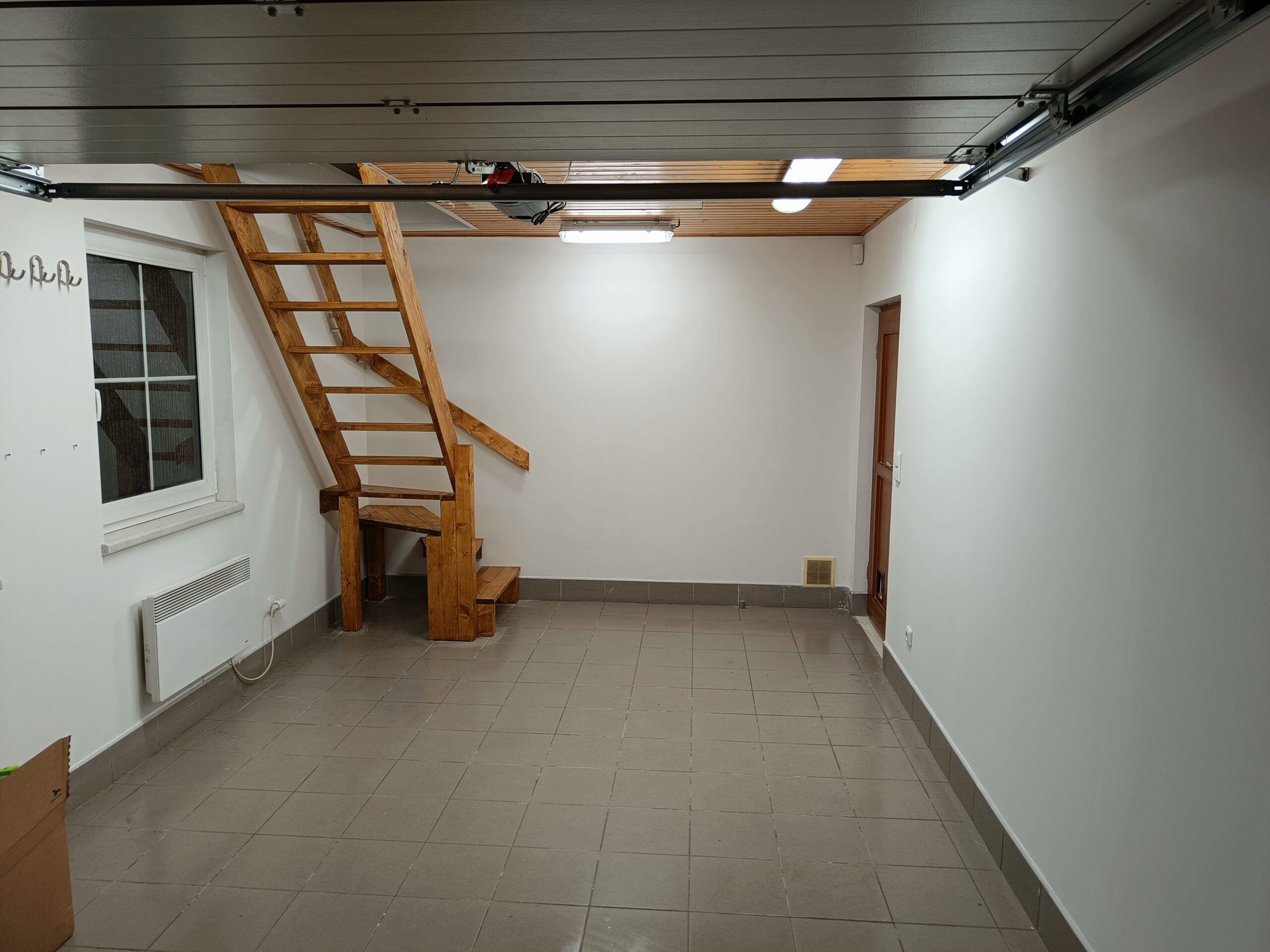 Dřevěné schody do patra z garáže.