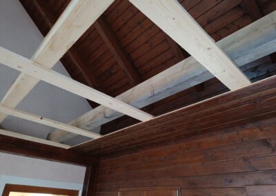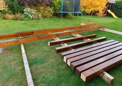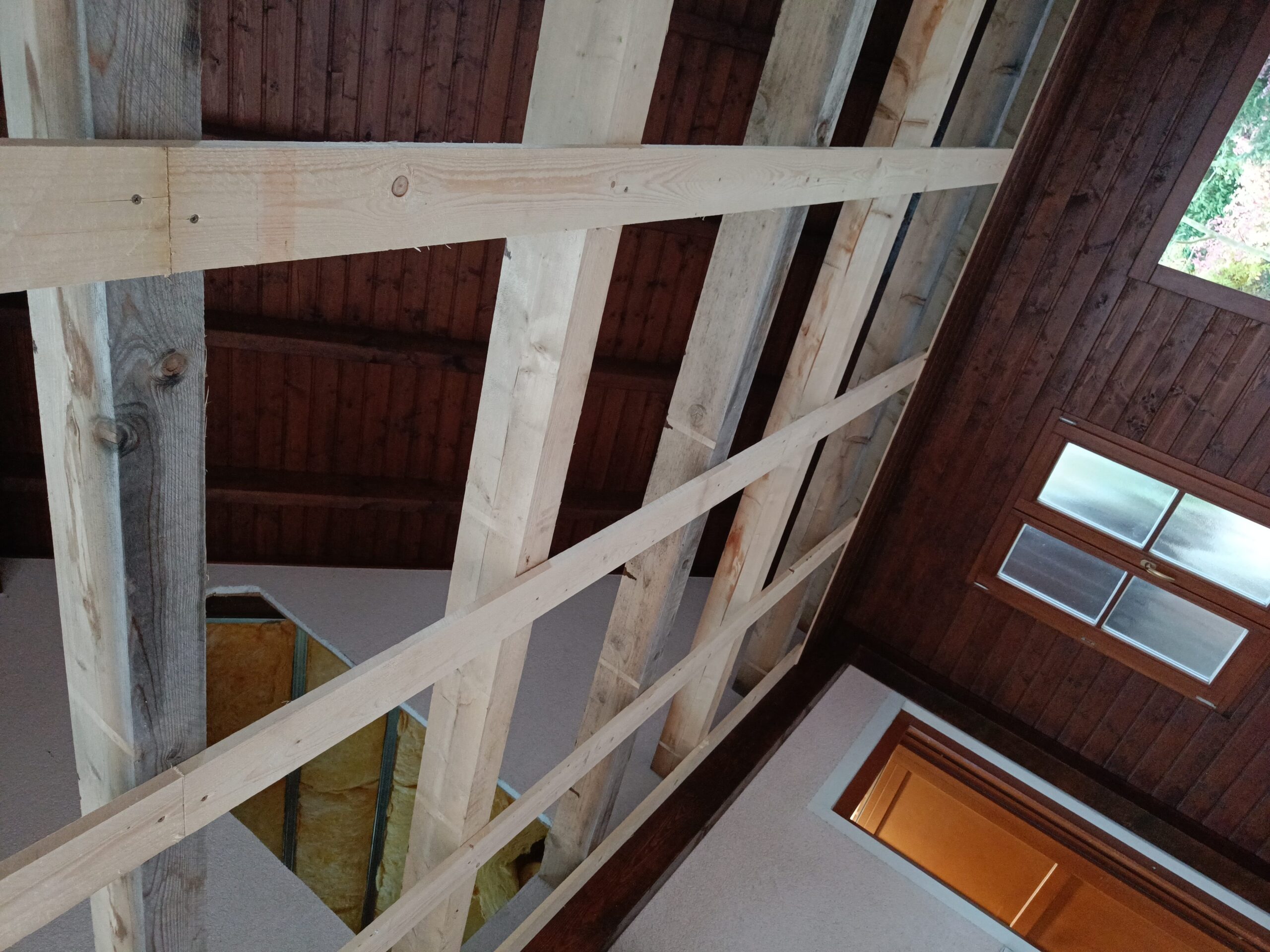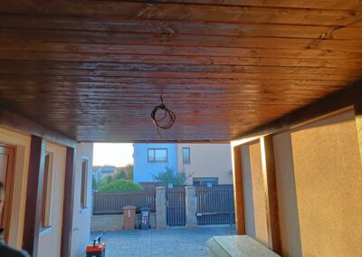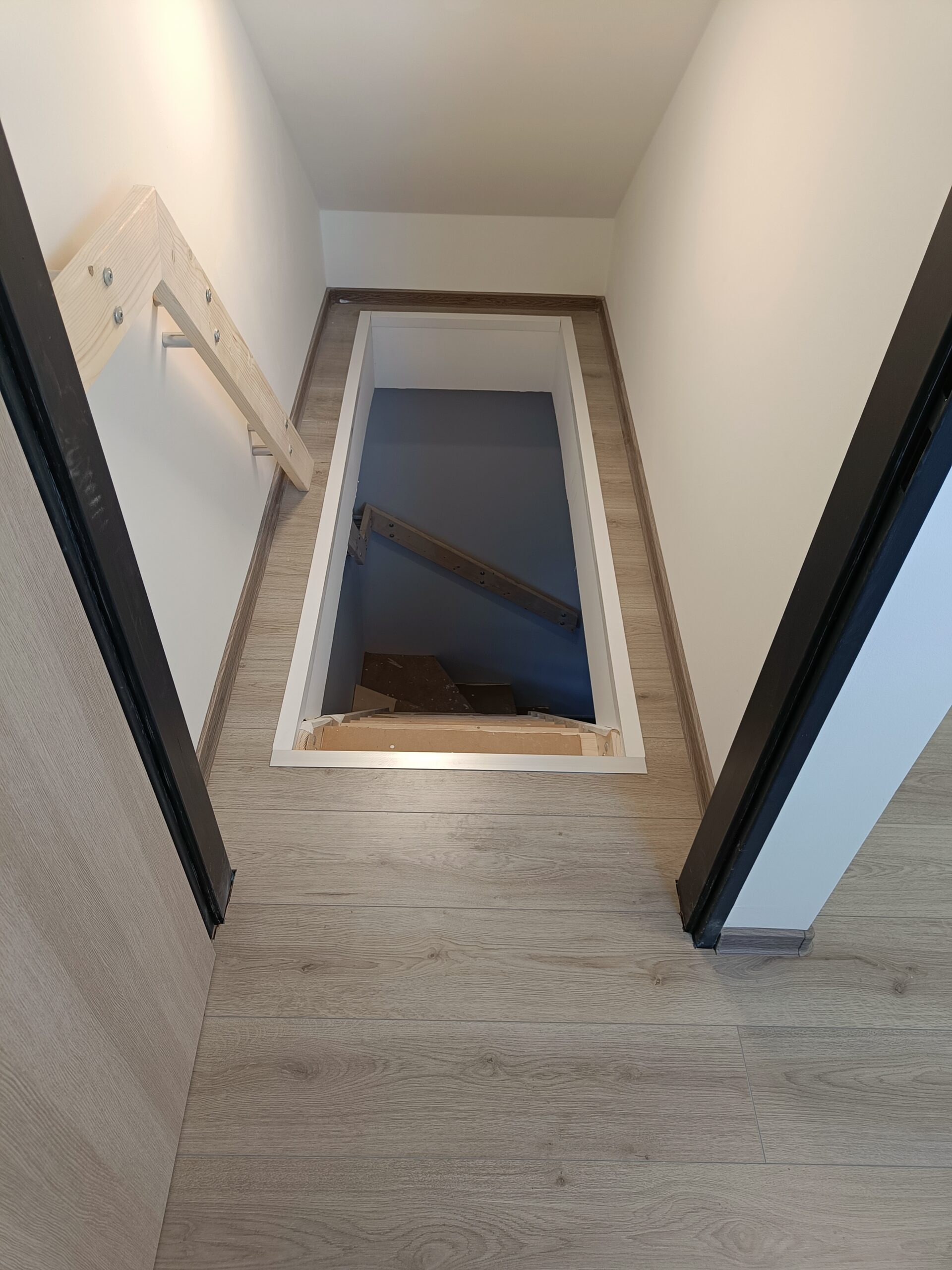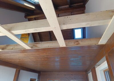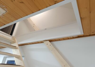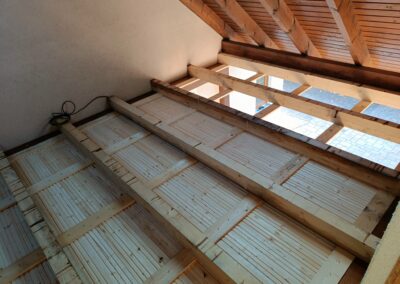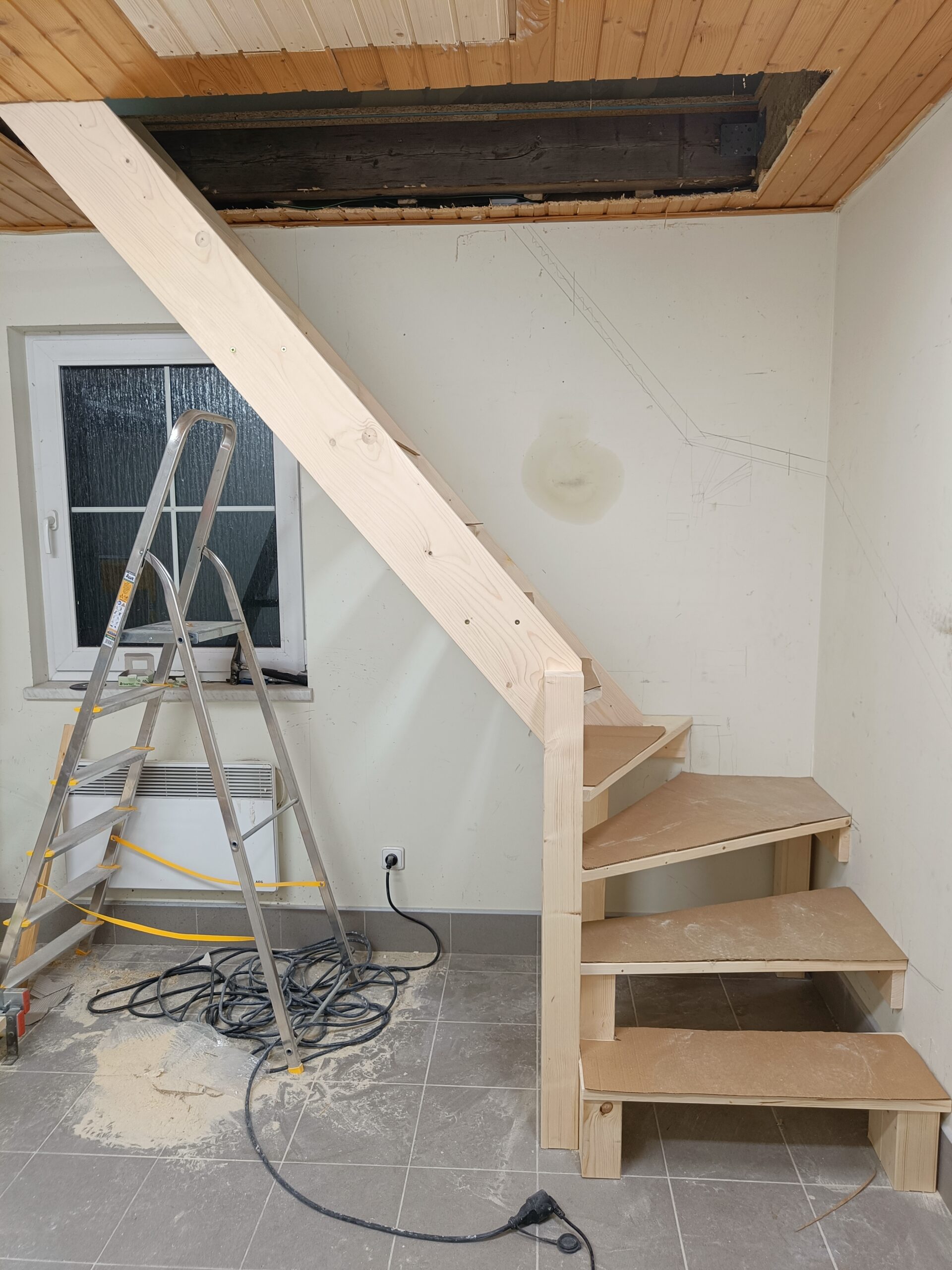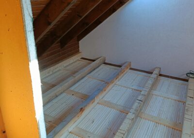 Dřevěné schody do patra z garáže.