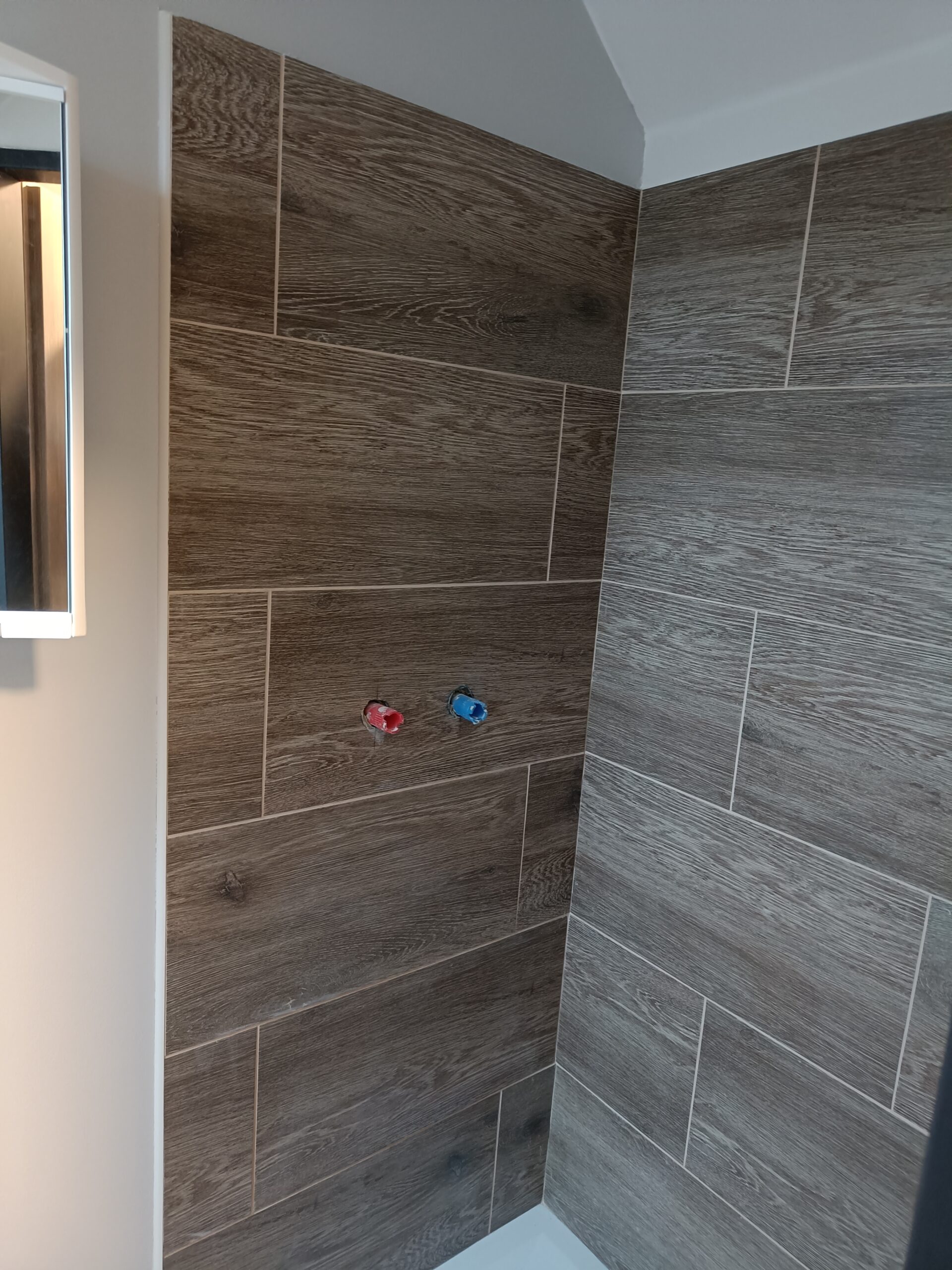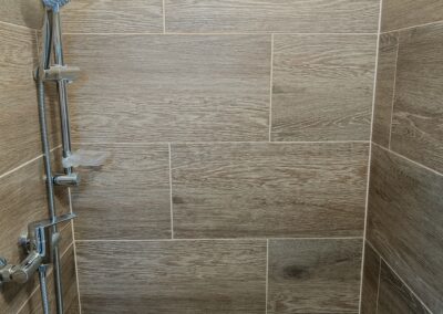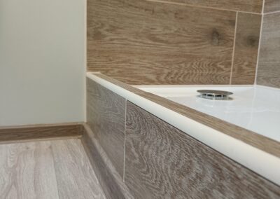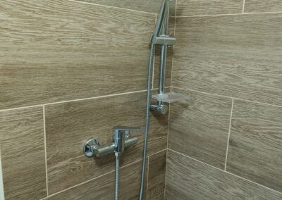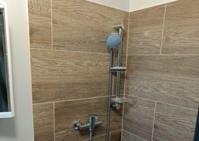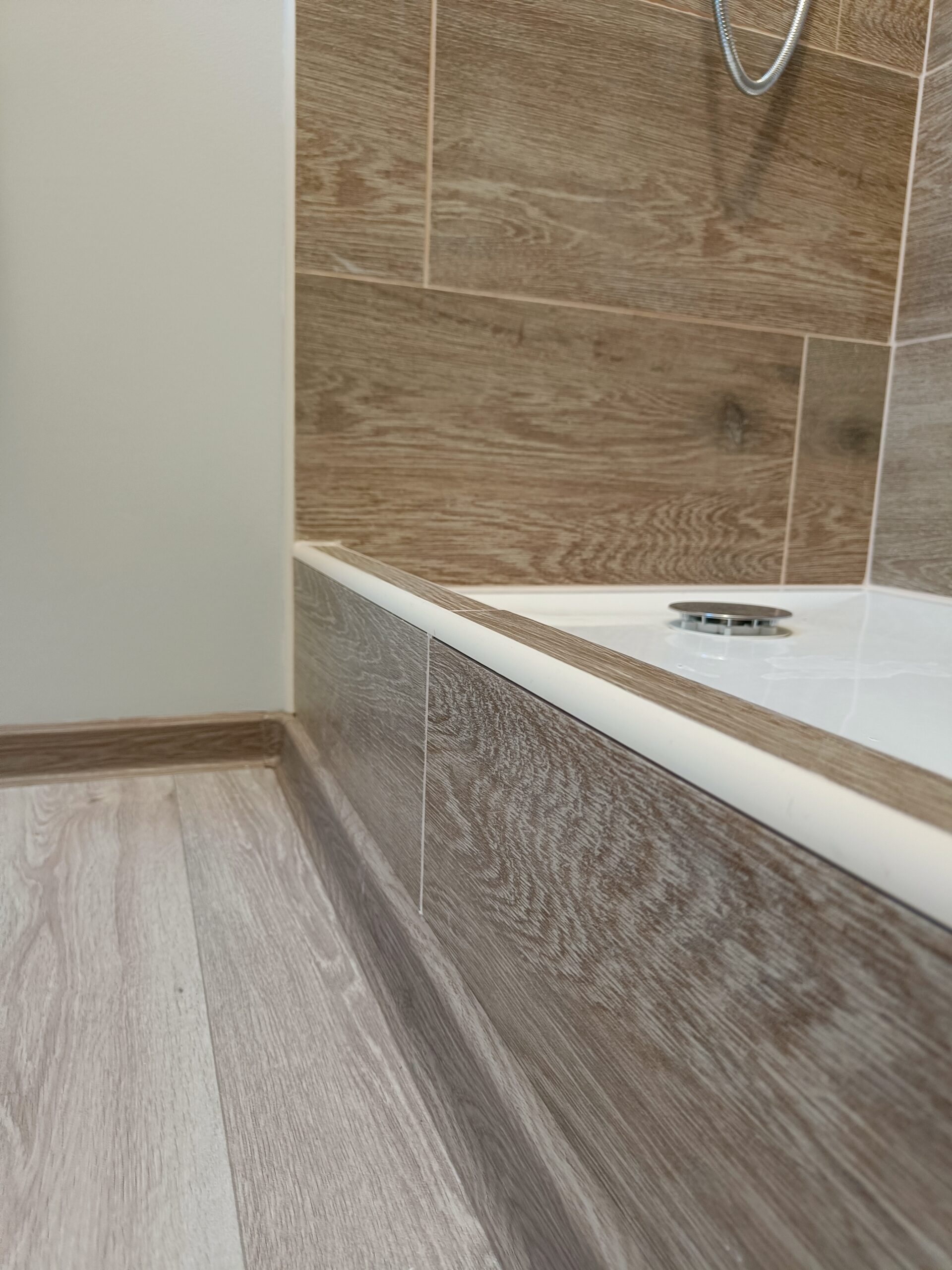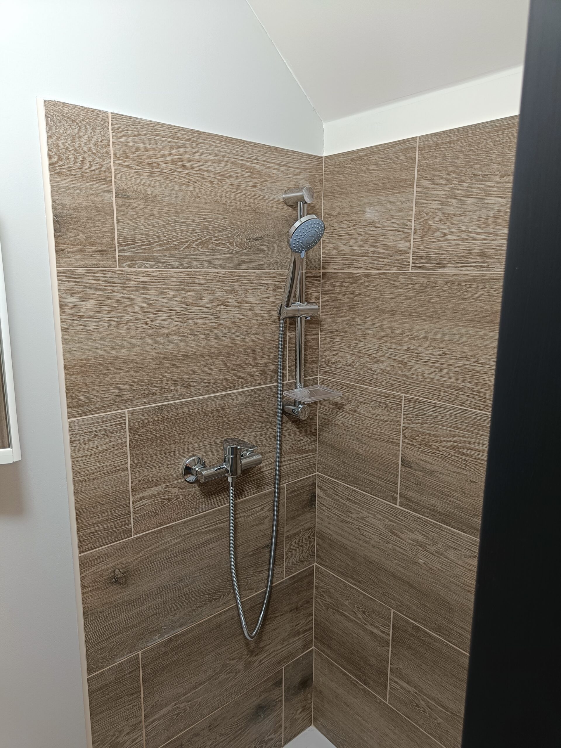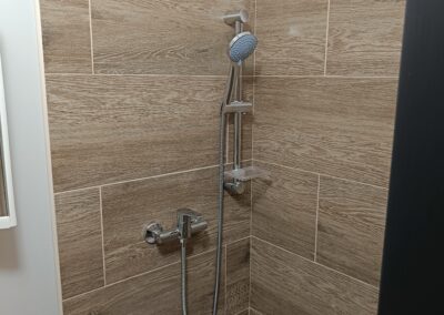 Obklad sprchového koutu s vaničkou a baterií.