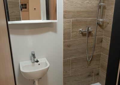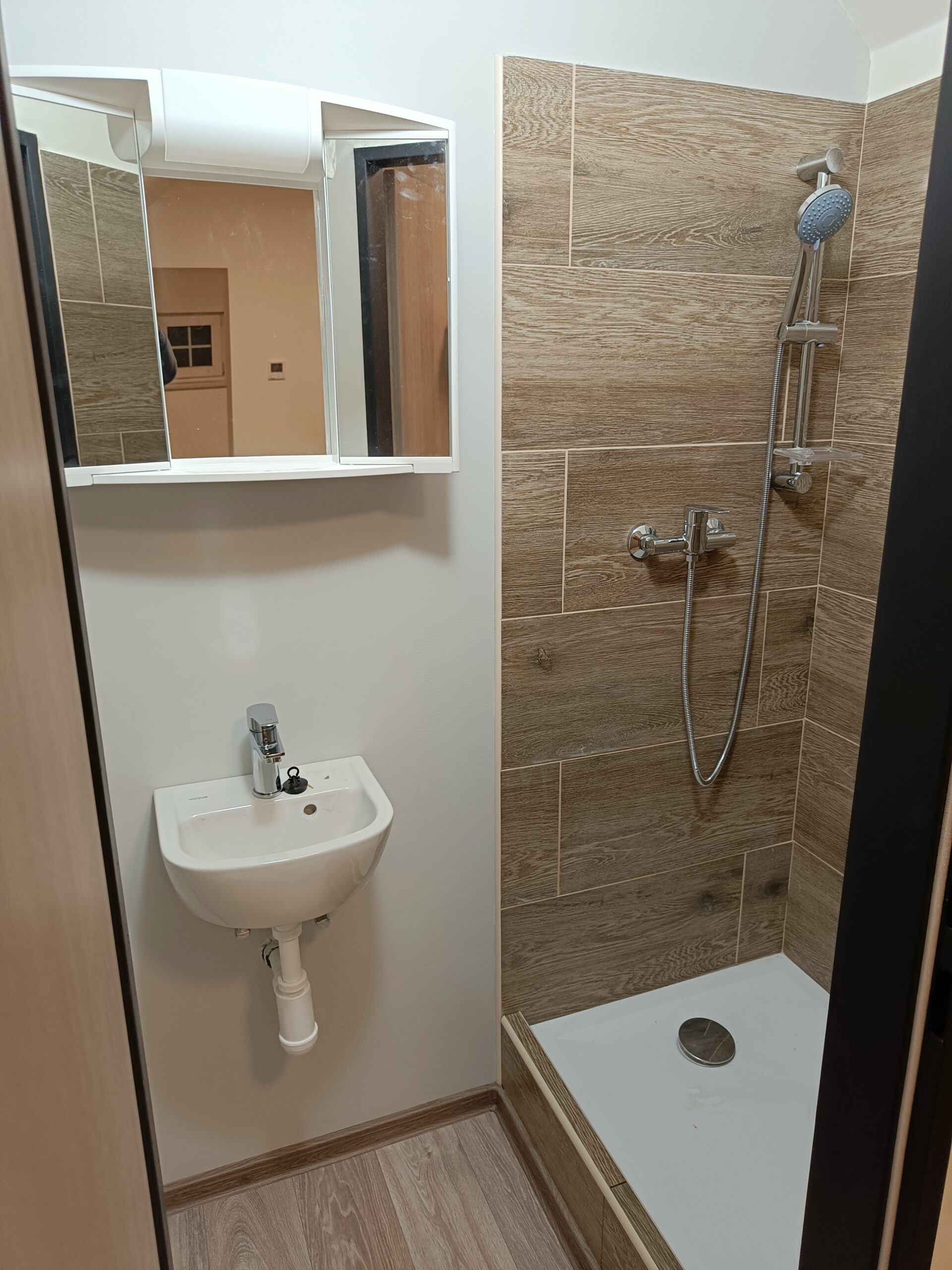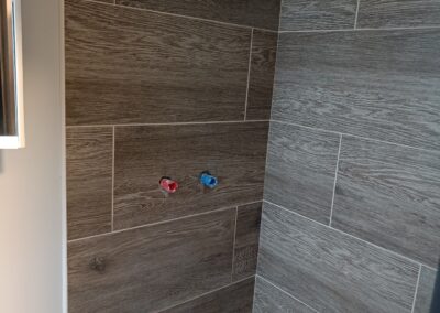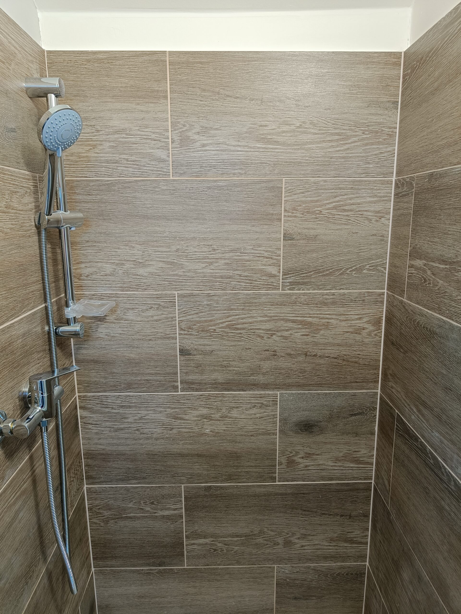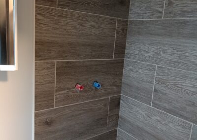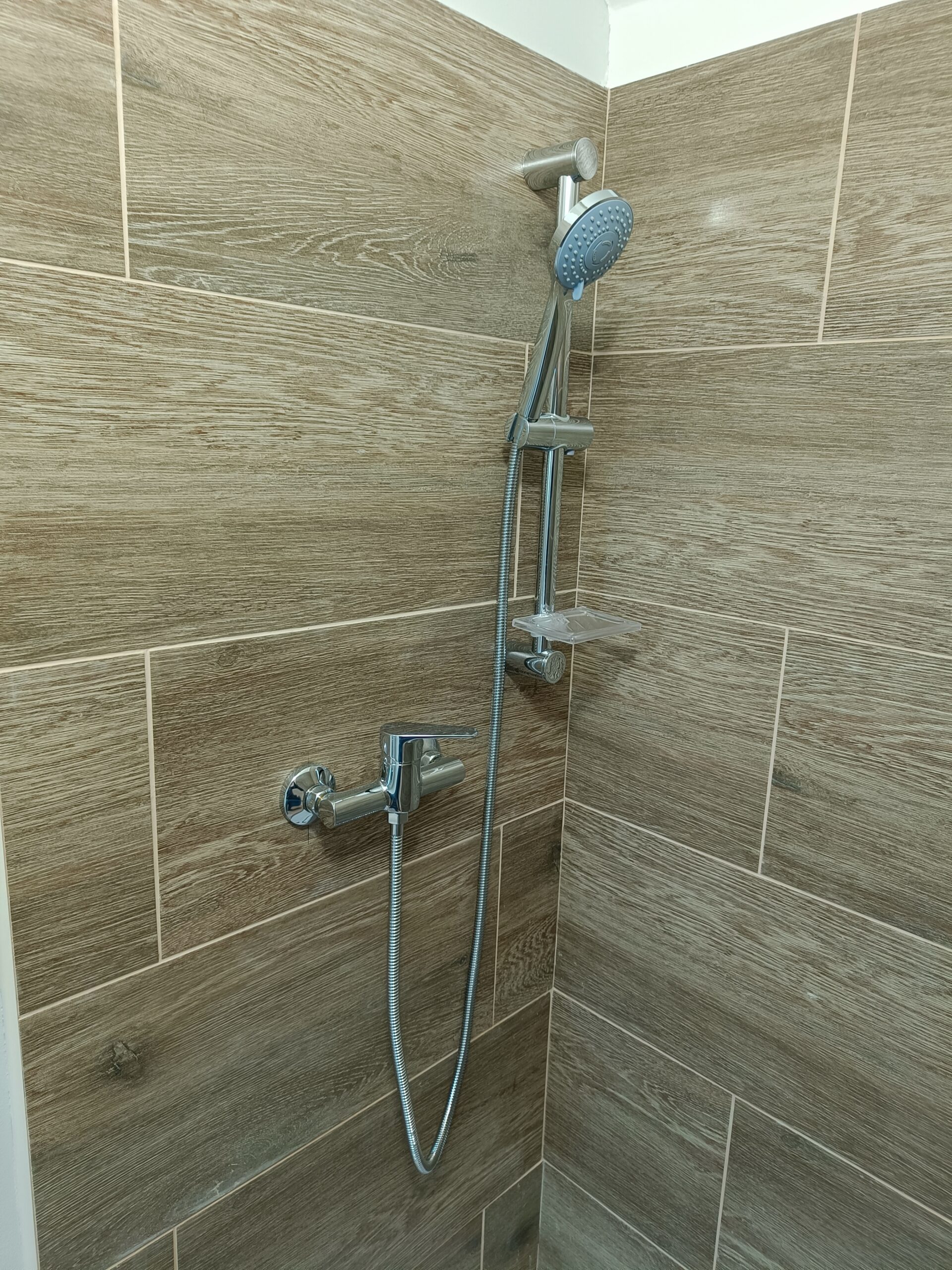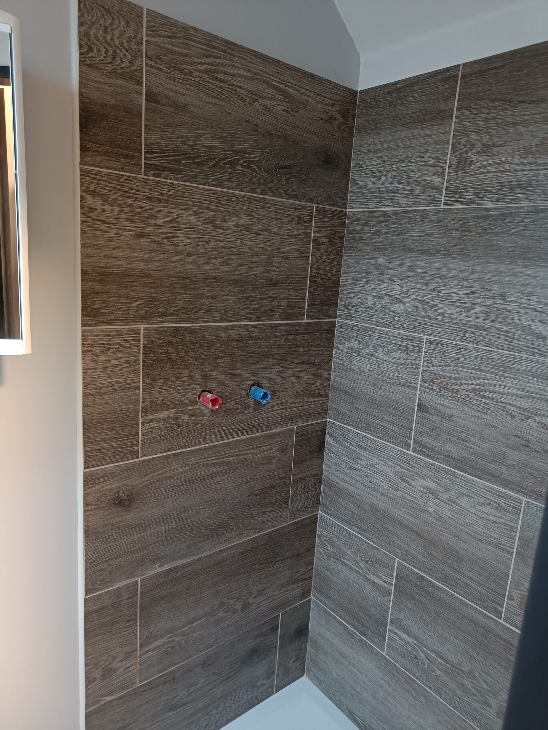 Obklad sprchového koutu s vaničkou a baterií.